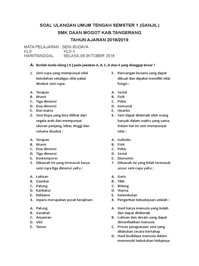 Latihan Soal Ptsuts Seni Budaya Kelas 8 Smp Semester 1